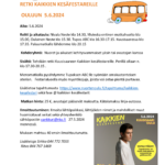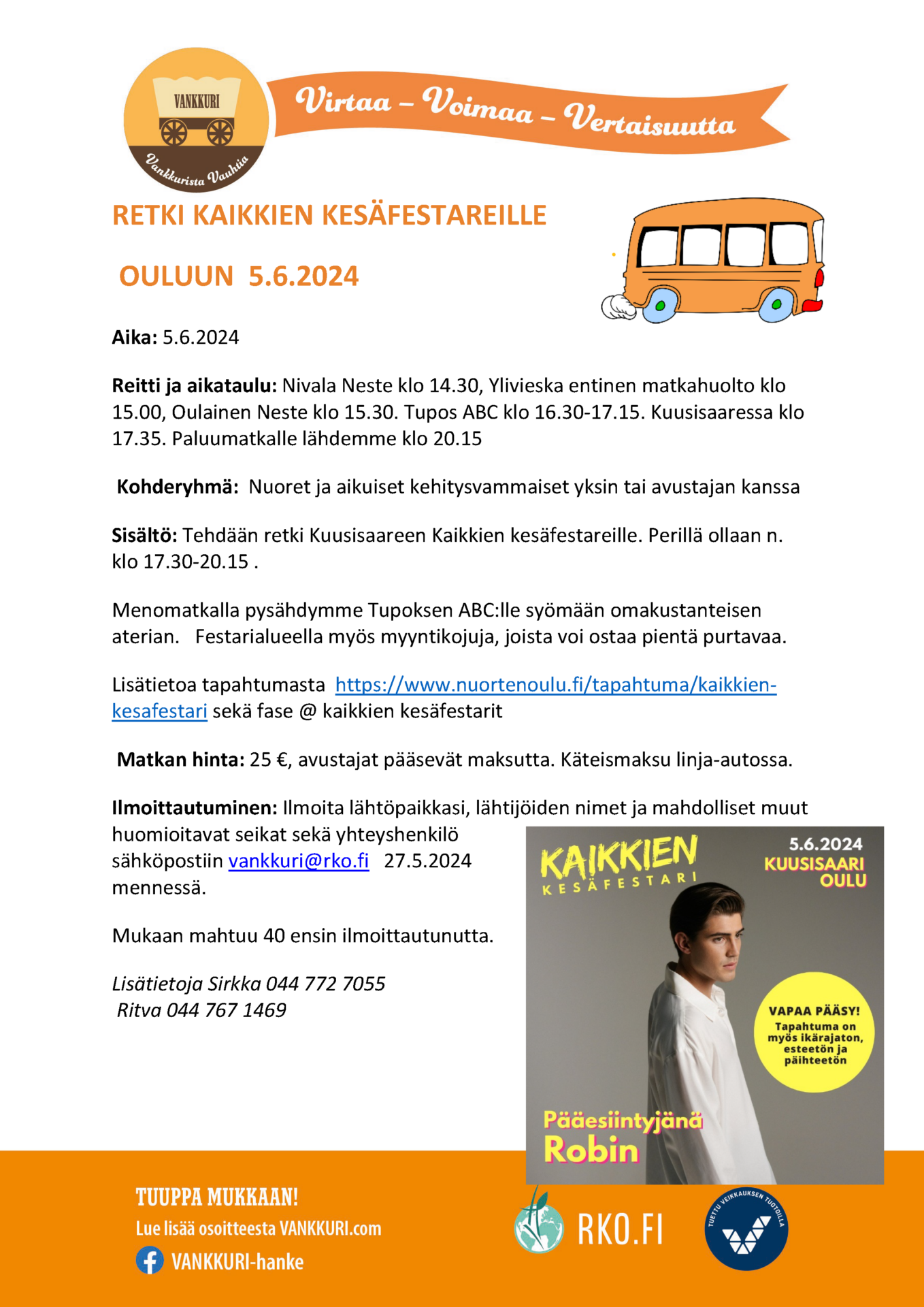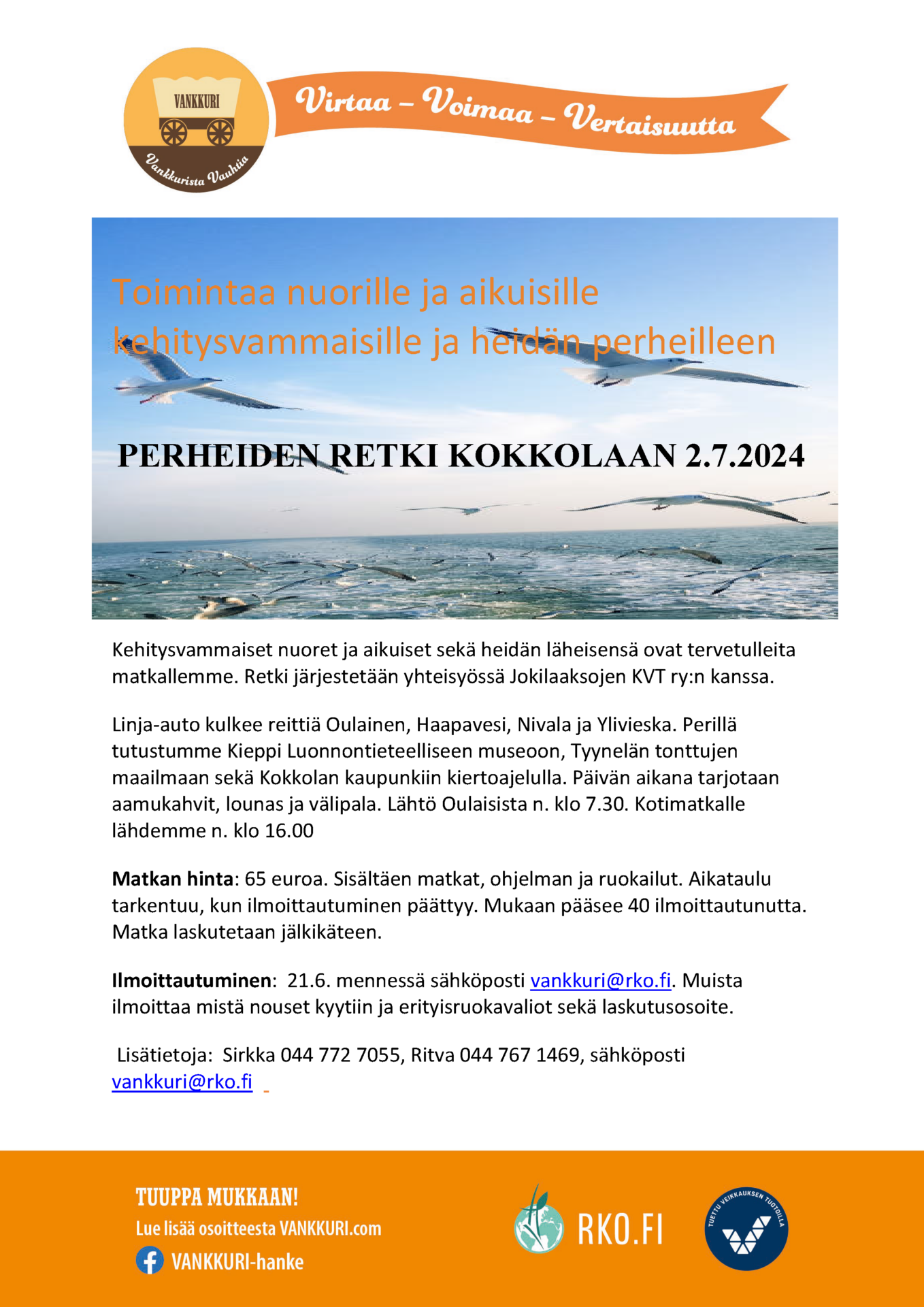 - Perheiden retki Kokkolaan 2.7., tutustumme luonnontieteelliseen museoon Kieppiin, Tyynelän tonttujen maailmaan sekä Kokkolan kaupunkiin kiertoajelulla. Hinta 65 euroa (sis. matkat, ohjelman ja ruokailut). Ilmoittautuminen 21.6. mennessä sähköpostilla vankkuri@rko.fi. Muista ilmoittaa mistä nouset kyytiin, erityisruokavaliot sekä laskutusosoite.