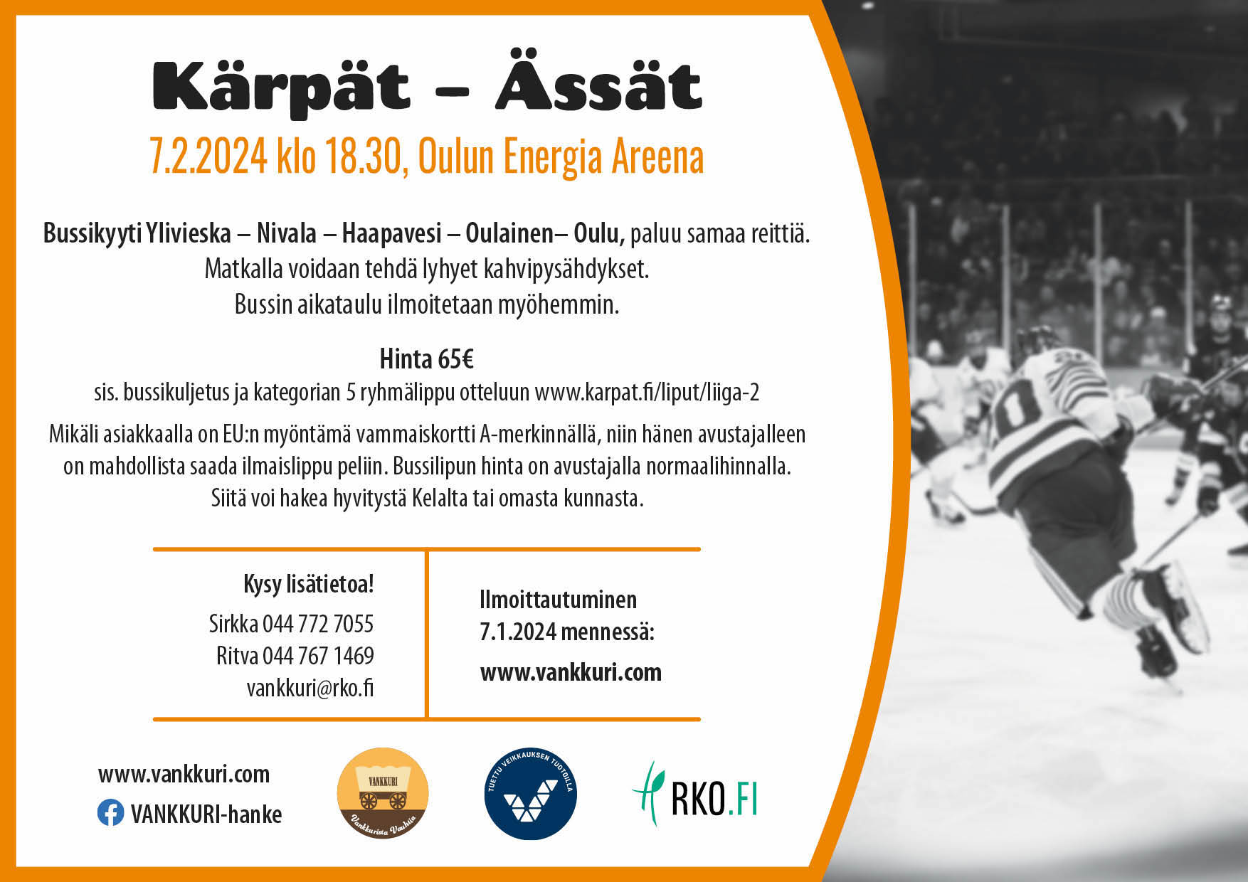 - Ke 7.2.2024 Kärpät – Ässät jääkiekko-ottelu, Oulun Energia Areena. Bussikyyti Ylivieska – Nivala – Haapavesi – Oulainen – Oulu, paluu samaa reittiä. Bussin aikataulu ilmoitetaan myöhemmin. Hinta: 65 euroa sisältää bussikuljetuksen ja kategorian 5 ryhmälippu otteluun (karpat.fi). Ilmoittautuminen 7.1.2024 mennessä tästä!